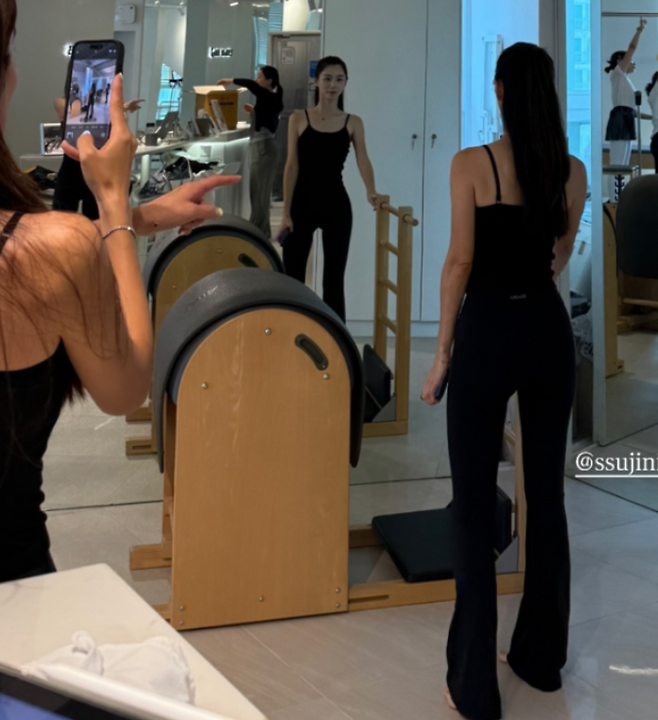 필라테스 기구를 잡고 있는 손끝, 단정히 정리된 헤어, 꾸밈없는 민낯에도 돋보이는 또렷한 이목구비까지—박수진은 ‘관리의 정석’ 그 자체.