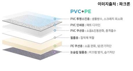 롤매트 구조를 살펴보면 표면에는 PVC를 사용하여 쫀쫀하고, 복원력과 내구성이 뛰어나 충격 흡수효과가 좋도록 구성되어 있습니다. 그 아래에 발포 PE폼을 덧대 두께를 보강한 구조로 충격과 소음을 잡아주는 기능을 합니다.