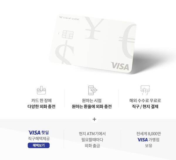 트래블월렛은 180만원 충전 한도가 있어 고가의 쇼핑을 하지 않을 여행객들에게 적합한 방법입니다. 원하는 시점의 환율로 환전을 마치고 현지에서 체크카드처럼 사용할 수 있는 카드도 함께 발급받을 수 있는데요. 일반적인 비자, 마스터 카드는 외화 결제가 아닌 원화결제가 되어 환전 수수료뿐만 아니라 해외 결제 수수료까지 부과됩니다. 트레블 월렛은 미리 충전한 외화를 사용하기 때문에 해외결제 수수료가 없다는 장점이 있습니다.