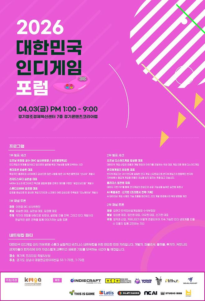 이번 포럼은 대한민국 인디게임 생태계의 현재를 돌아보고, 창작과 비즈니스, 커뮤니티가 연결되는 교류의 자리를 만들고자 기획됐다. 인디 개발자들의 창의적인 도전과 산업의 지속 가능한 성장 방향을 함께 논의할 예정이다. 해당 행사는 'NC AI'와 '플레이나누'가 후원사로 참여한다. 포럼은 1부와 2부 세션, 그리고 네트워킹으로 구성된다.