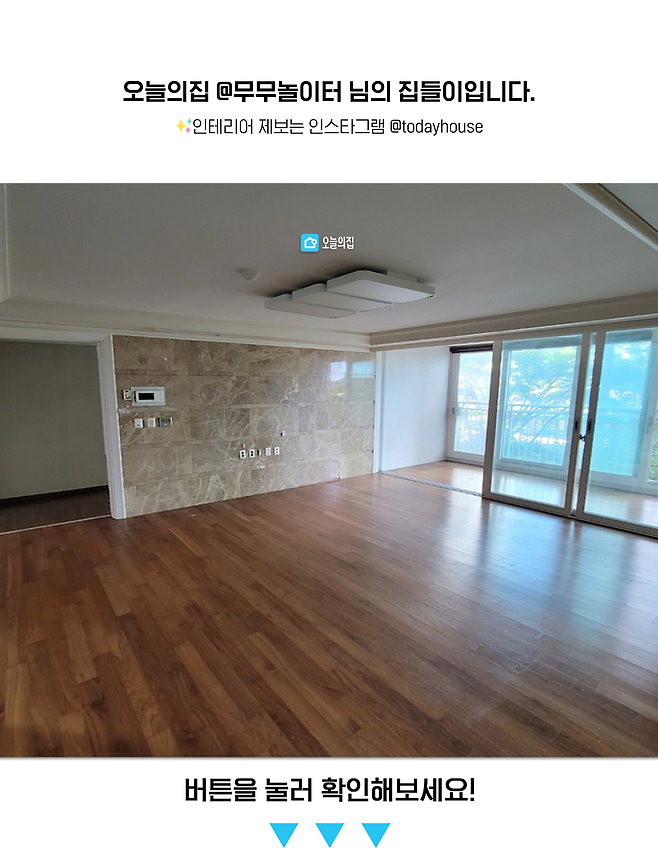 거실 리모델링 하기 전 모습이에요. 짙은 강마루는 다 걷어내고 안방 문이 있던 곳은 철거 후 아치로 만들어 주었어요. 대리석 벽은 벽지를 발라주어 깔끔하게 해주고 베란다 문은 철거하여 폴딩 도어를 설치해주었답니다.천장은 등 박스를 만들어주어 실링팬을 설치하고 3인치 조명과 간접등을 넣어 포근함과 안락함을 추가해주었어요.