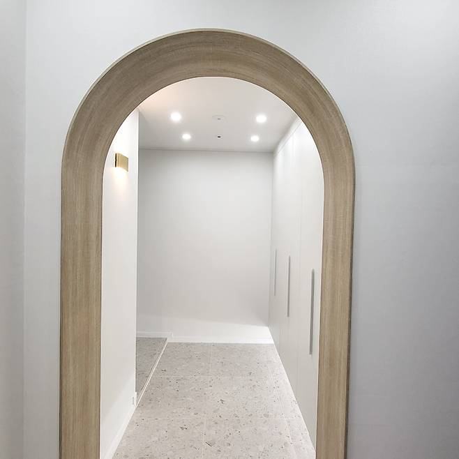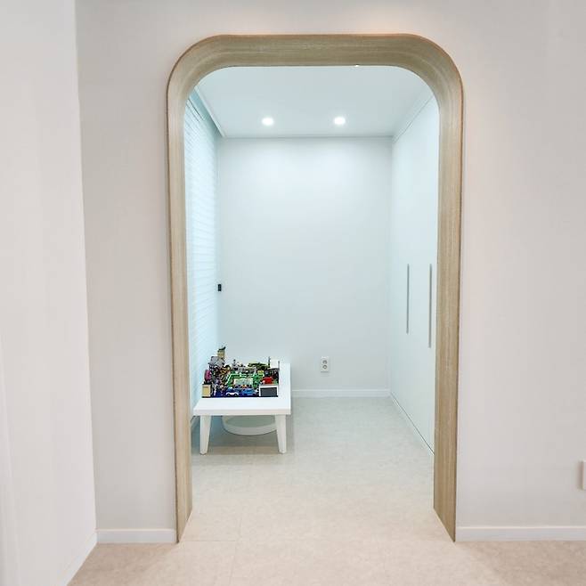 식빵 아치 두 군데 가 보이시죠? 왼쪽은 레고 방 오른쪽은 안방으로 들어가는 아치 에요. 아치 안쪽을 우드 느낌으로 해주어 잘 구워진 식빵 한쌍 아치에요.^^