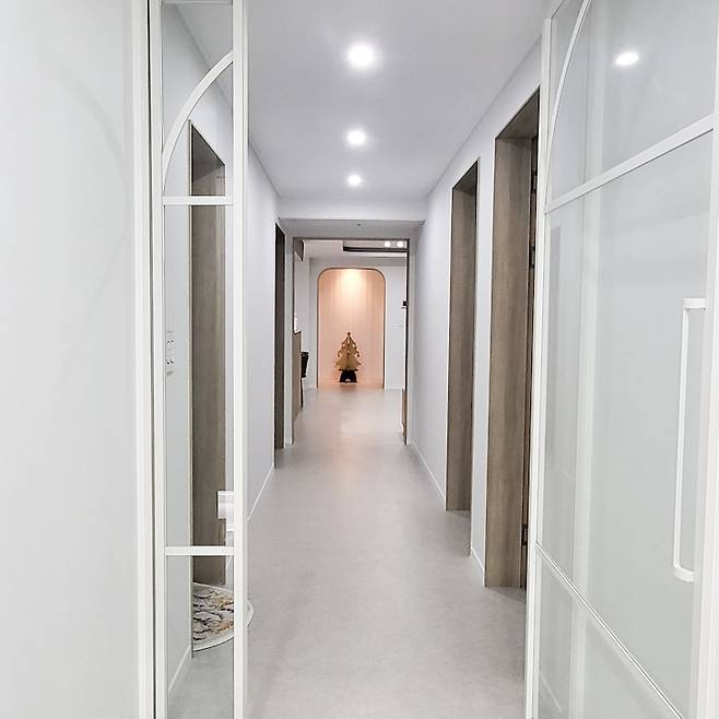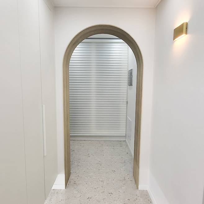 중문을 열면 길고 시원한 복도가 맞이하여 주는데요. 원래는 복도 끝 트리 있는 곳이 안방 문이 있는 곳이었으나 복도를 길게 보이기 위해 그 부분은 아치로 만들고 안방 문은 가벽을 만들어 안쪽에 따로 문을 달어 두었어요. 훨씬 개방감 있고 좋지 않나요?^^ 사실 남편의 의견인데 도움이 될 때도 있더라는. 흠흠.