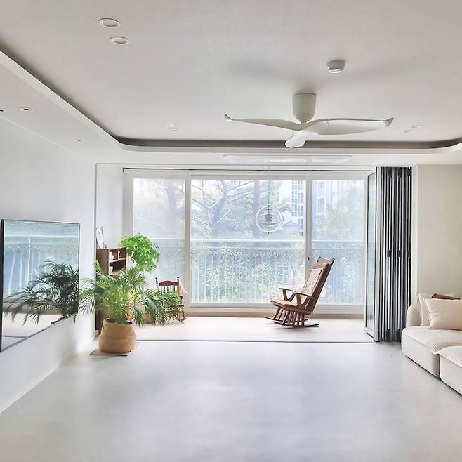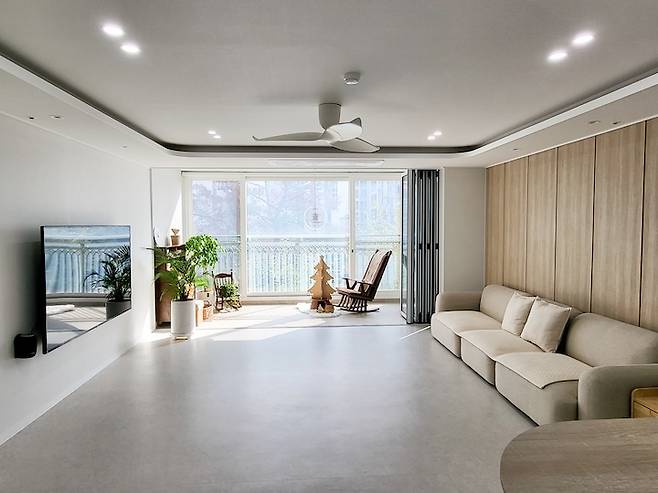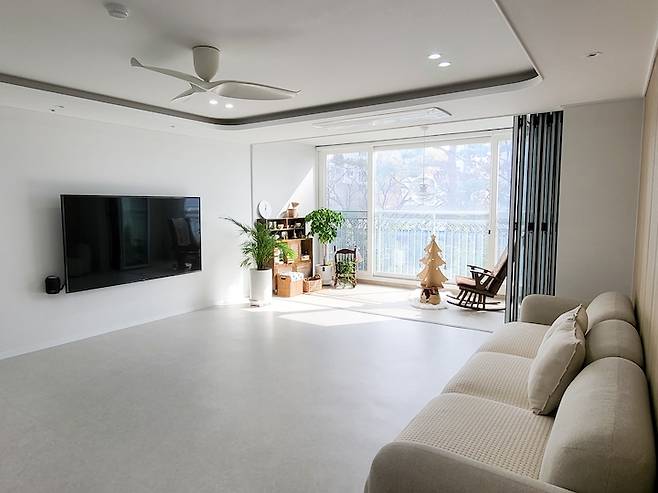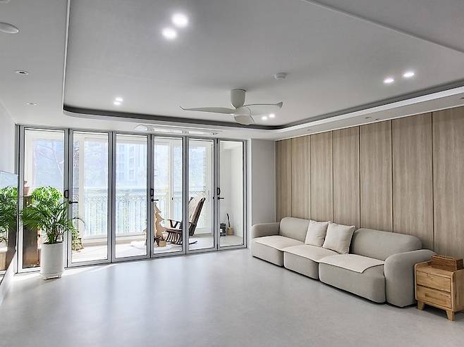 폴딩을 닫았을 때의 거실의 모습이에요. 폴딩을 열었을 때와는 또 다른 깔끔함이 느껴지시죠? 닫아 놓으면 겨울에는 난방 효율을 높여주고 여름에는 냉방 효율을 높여주는 사랑스러운 녀석이에요. 폴딩을 고민하신다면 적극적으로 추천드려요.