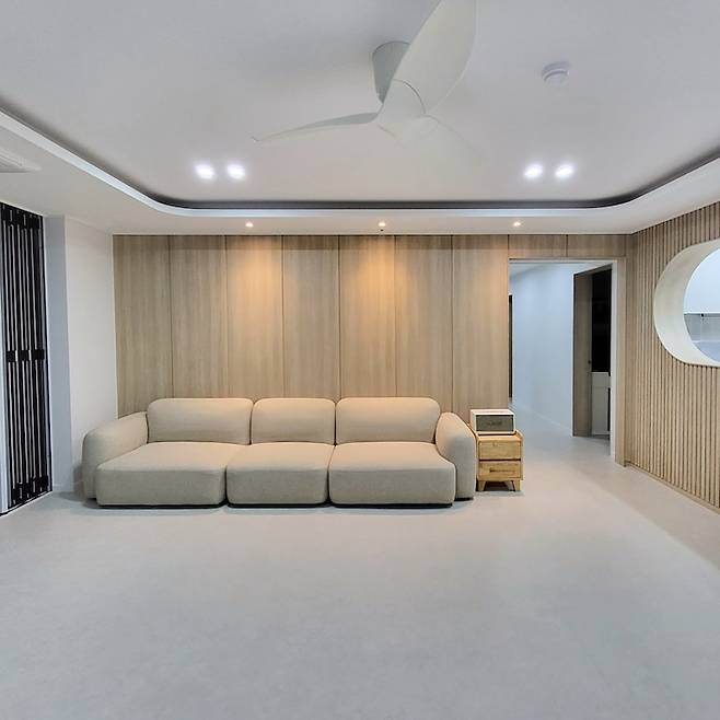 저희 집 거실이에요. 대리석이 있던 자리는 벽지로 깔끔하게 마감하고 TV를 달아 주었어요 TV 맞은편 자리에는 소파를 배치해 TV를 편하게 볼 수 있게 해주었답니다. 천장에는 시스템 에어컨을 깔끔하게 설치해주고 실링팬도 달아주었어요. 실링팬과 시스템 에어컨이 만나면 시너지가 배가 된답니다.