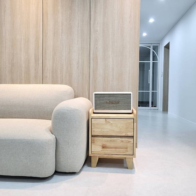 소파 옆 협탁은 아이들 방 침대 옆에 있던 거에요. 거실에 들고 나와봤더니 잘 어울려 저 자리에 두게 되었어요. 굴러다니는 리모컨들을 넣어서 쓰고 있는데 리모컨들을 한 곳에 모아 놓으니 너무 편하답니다.