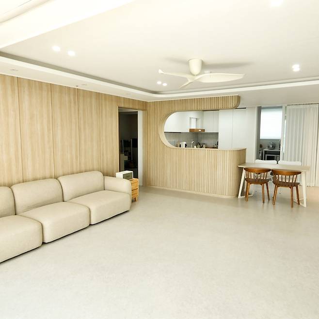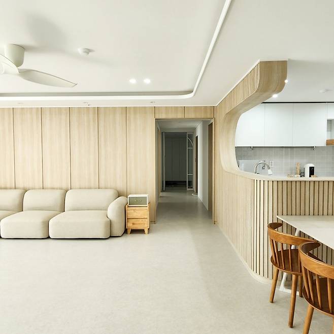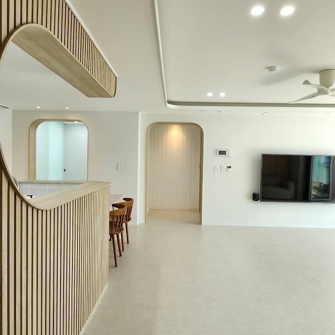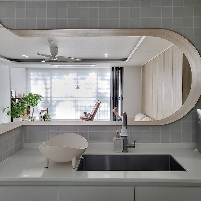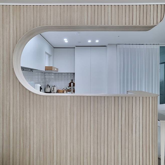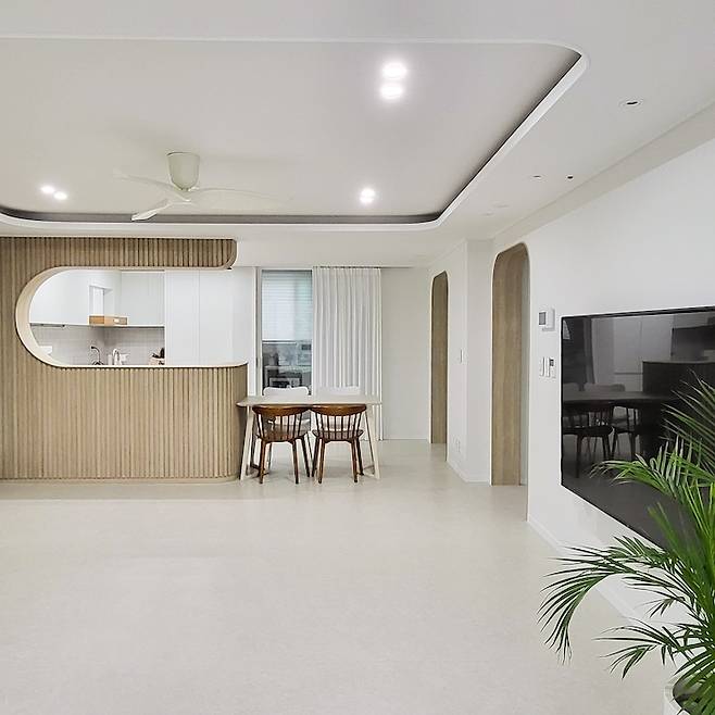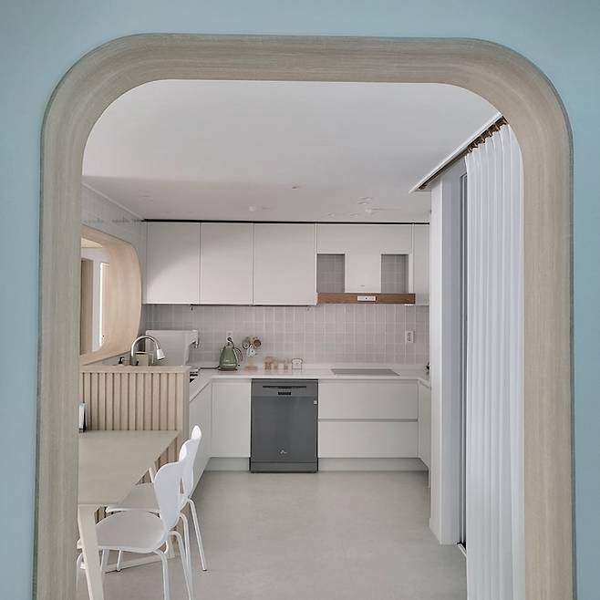거실에서 바라본 주방의 모습이에요. 부드러운 곡선 아치가 정말 예쁘지 않나요?*^^* 골치였던 내력벽이 오히려 도와주어 이렇게 예쁜 주방이 탄생할 수 있었어요. 감사해요 내력 벽!