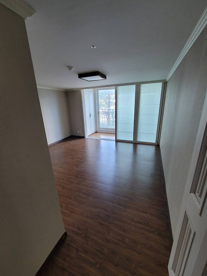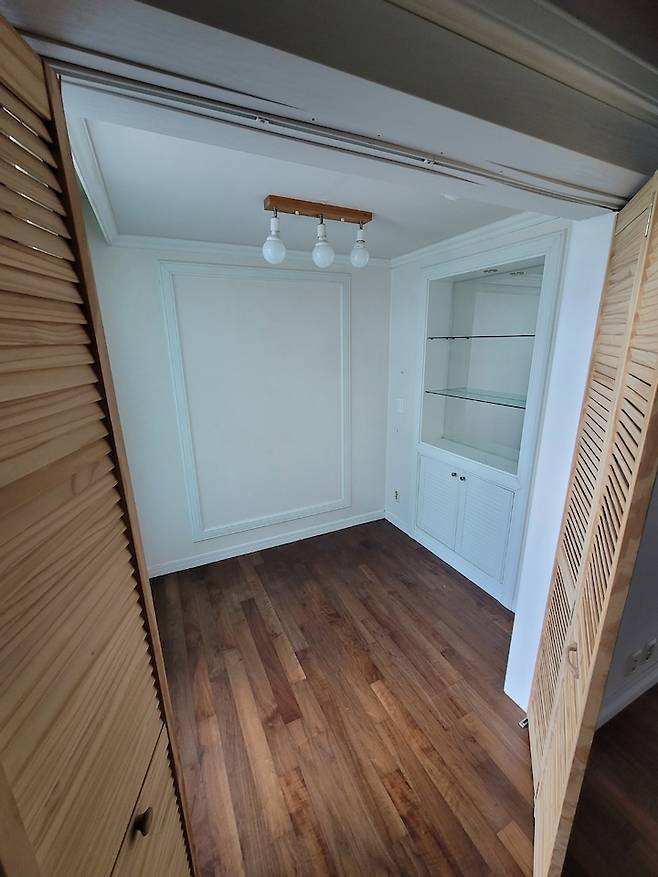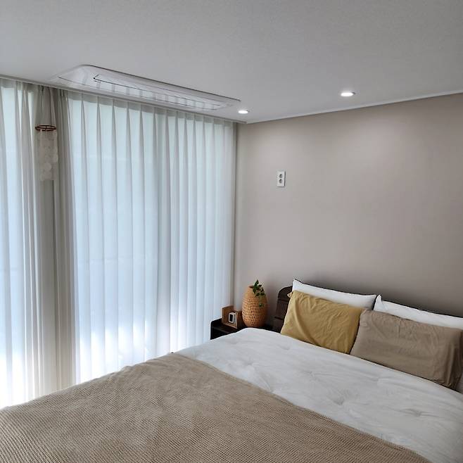안방역시 모든 부분을 철거하고 시스템 에어컨을 넣어 주었어요. 바로 왼쪽에 툭 튀어나온 부분이 드레스 룸이었는데 이부분을 철거하여 공간감이 넓어 보이는 안방으로 만들었어요.