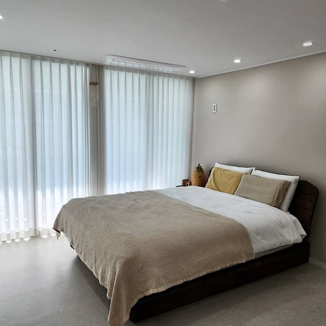 침대는 평상형 타입이라 넓어서 에이스 매트리스 킹 사이즈도 충분히 가능하여 넓고 편안하게 쓰고 있어요. 커튼은 차르르 샤르르 커튼 아시죠??저의 집에 쓰던 걸 사이즈만 조절해서 다시 달아주었는데 꼭 맞아 만족스러워요. 붙박이장은 슬라이딩 형식으로 짜 맞추어 주어 공간을 넓게 쓰게 해주었어요.
