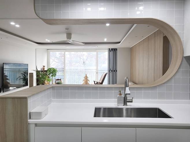 곡선 아치가 있는 부분은 바로 설거지 대면형 주방의 자리예요. 설거지를 하면서 티비도 보고 밖의 풍경도 볼 수 있어 너무 좋답니다. 특히 아들의 행동 감시도 가능해요. ㅋ ㅋ