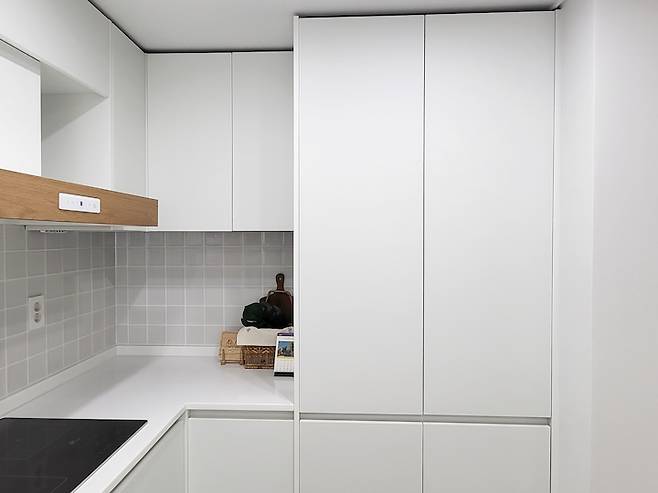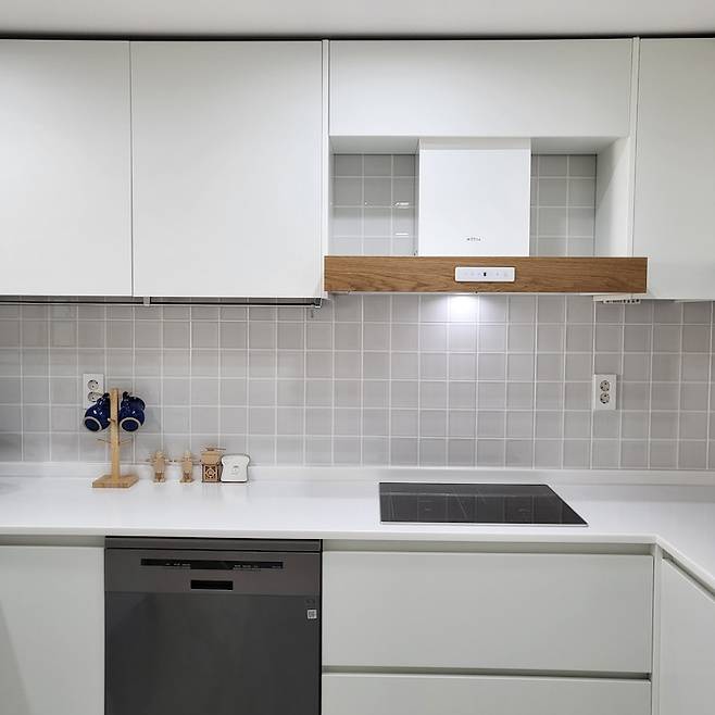 주방은 화이트를 기본으로 하고 후드에 우드로 포인트를 주었어요. 인덕션과 식기세척기는 기존 집에 있던 것을 가져와 썼는데 어쩐지 동동 뜨는 것 같기도 하고 언젠가는 저도 화이트 식세기와 인덕션을 가질 수 있겠죠? ^^;;