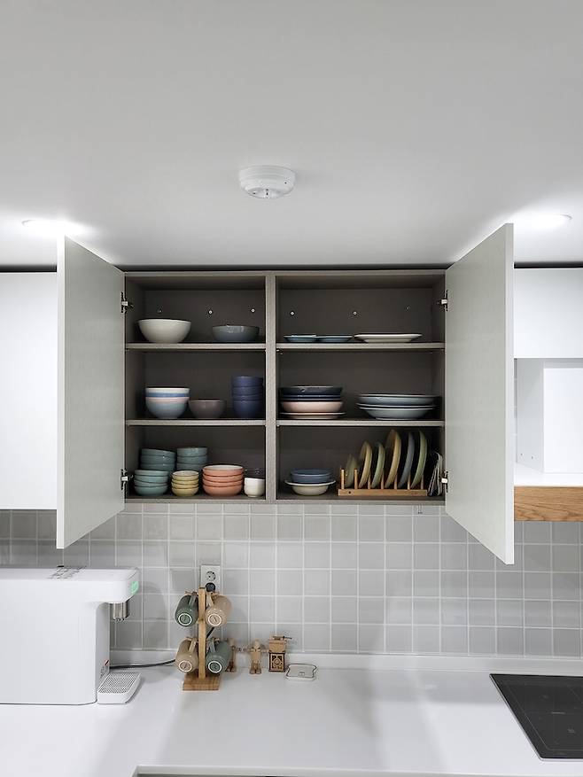 주방에 물건들을 올려두는 걸 좋아하지 않아서 식기들도 수납하여 쓰고 있어요. 먼지 닦는 게 싫은 것도 한몫 하고요^^제 스타일과 닮은 모던한 덴비 식기들도 최소한만 두어 수납하고 있답니다.