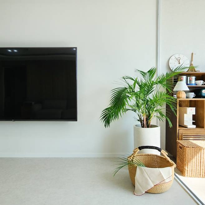 TV 밑 장식장은 이사 오면서 처분하고 두지 않았는데 없으면 수납은 어쩌나 고민이 무색하게 없이도 잘 지내고 있어요. 소파 뒤 아트월과 TV위에는 간접 조명을 넣어주어 밤에도 편안하게 TV를 볼 수 있게 해주었고 아트월은 우드 느낌으로 포인트를 주어 우드 앤 화이트 집의 컨셉에 한몫 톡톡히 해주고 있어요.