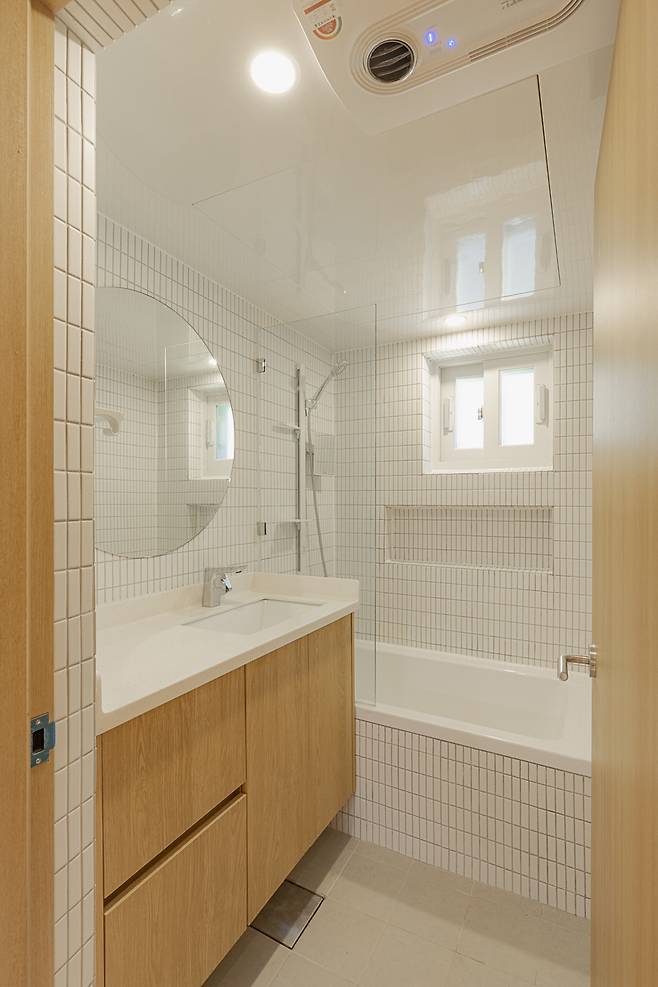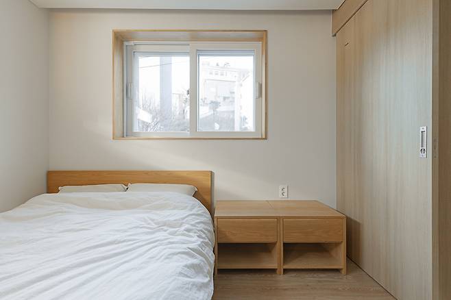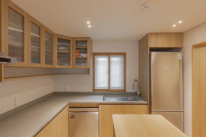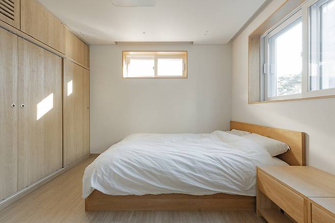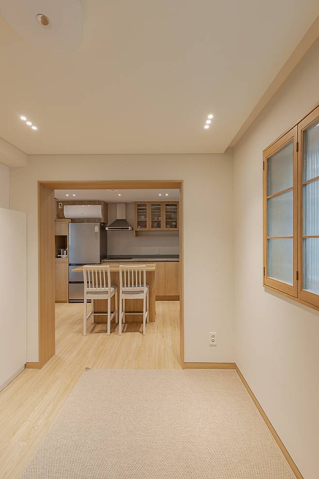 내부는 건축주의 취향을 반영해 따스한 느낌의 목재 중심 인테리어로 구성했다. 리모델링이 결정되고 제일 먼저 진행된 것은 단독주택에 맞는 공간과 동선을 만드는 것으로, 임대세대와 주인세대를 분리하며 구성되어 있던 외부계단과 세대별 현관을 철거하고, 이를 통해 확보한 1층 현관 옆에는 화장실을 구성했다. 2층 현관 또한 다용도실로 변경하여 실내공간으로 사용할 수 있도록 했다.