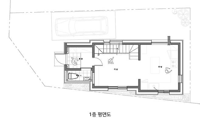 다가구주택에서 단독주택으로 변경하면서 필요 주차공간이 2대에서 1대로 감소하여 생긴 여유공간에 주방으로 통하는 폴딩도어를 두고, 데크를 구성하여 내부 공간을 외부로 확장할 수 있도록 했다.