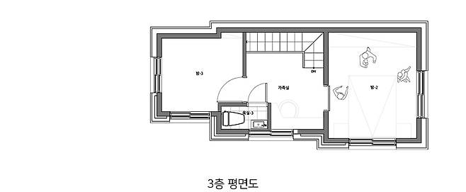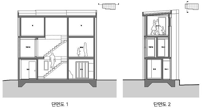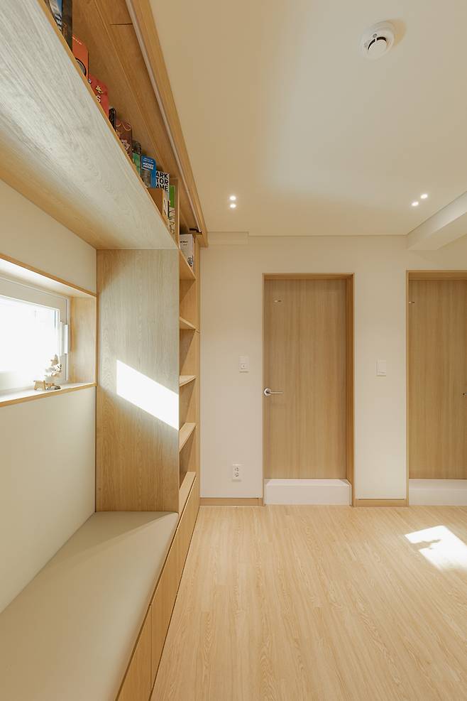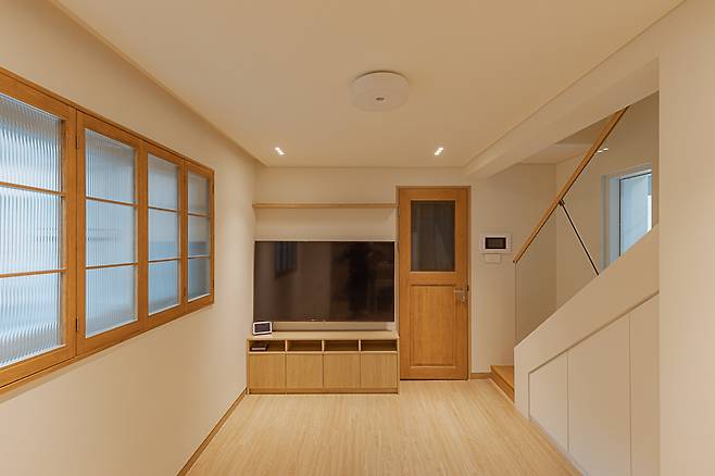 또한 외부계단 대신 세 개 층을 아우르는 층간 동선을 확보하기 위해 2층 슬래브를 일부 철거한 뒤 철골로 보강하여 주인세대에서 수직 동선으로 이용하던 내부계단을 1층까지 연결하였다. 1개 층에 30㎡가 조금 넘는 협소한 공간을 보완하기 위해 계단 하부나 틈새 공간에 최대한 많은 수납공간을 확보했으며, 계단 난간은 기존 목재 난간에서 강화유리 난간으로 변경하여 시각적인 답답함을 해소했다.