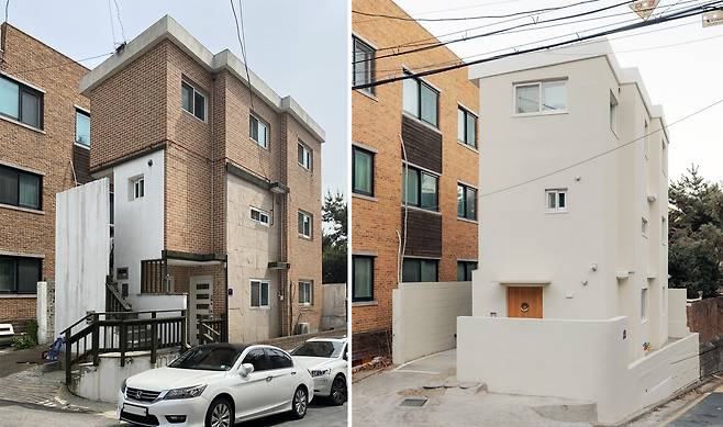 한정된 시간과 빠듯한 예산. 모든 곳에 힘을 싣기 어려운 상황에서 건축가는 세대를 나누던 외부계단과 2개의 현관을 철거하고, 기존 주인세대의 내부계단을 1층까지 확장해 3개 층을 아우르는 내부동선을 효과적으로 확보했다.