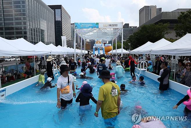 (서울=연합뉴스) 윤동진 기자 = 11일 오후 서울 광화문에 운영중인 2024 서울썸머비치에서 시민들이 즐거운 시간을 보내고 있다.