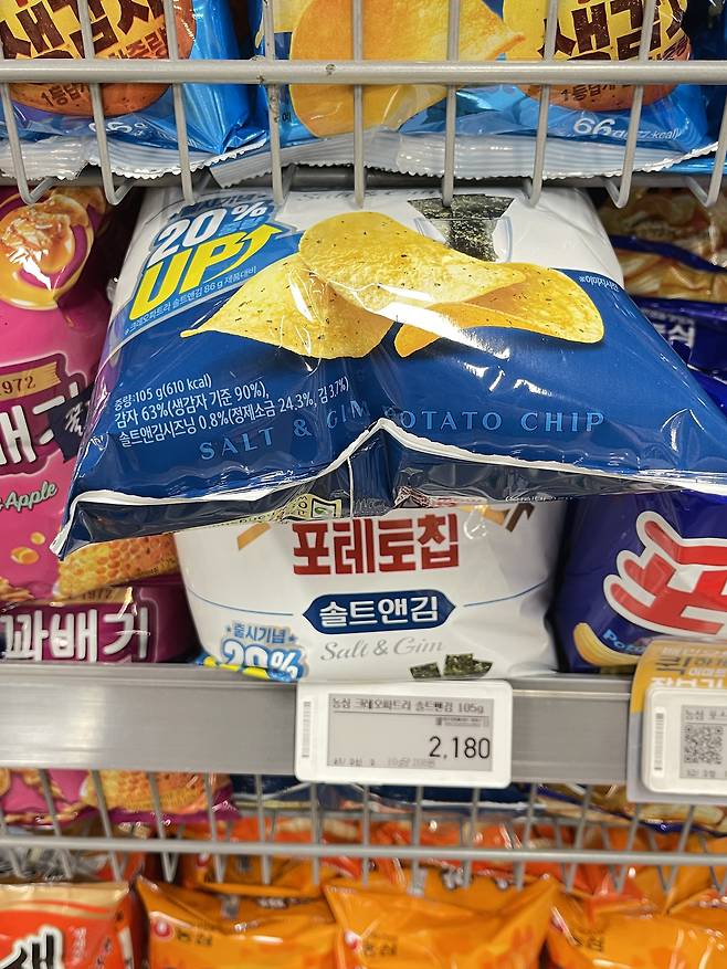김과 감자칩의 조합이 짭짤함으로 다가와 술을 부르는 술안주에요. 증량된 양이 매력적인 바삭한 감자칩이에요.