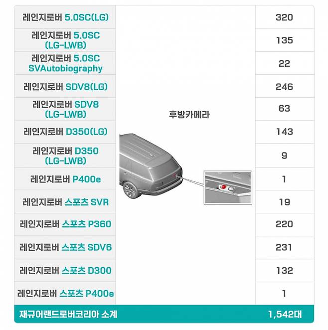랜드로버 레인지로버 5.0SC 등 13개 차종 1542대는 후방카메라 커버(하우징) 제조 불량으로, 3월 26일(화)부터 시정조치에 들어간다. 후방카메라 커버 제조 불량이 원인이며, 이로인해 수분이 침투되어 후방카메라 이미지가 나빠지거나 표지되지 않아 사고로 이어질 수 있다.