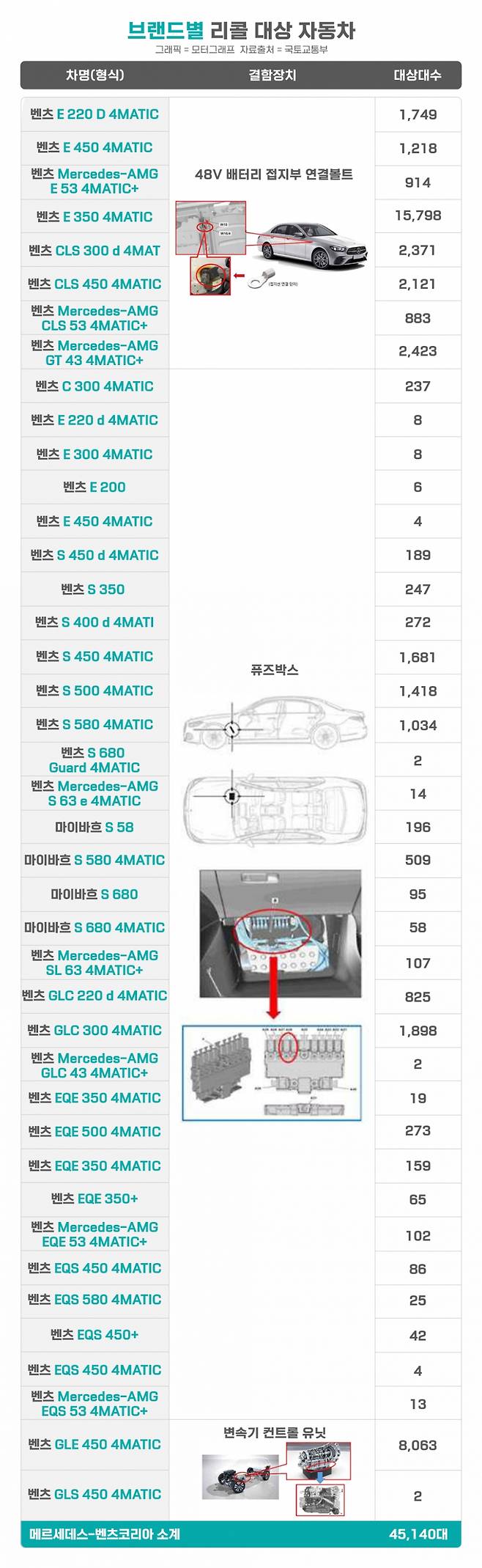 메르세데스-벤츠 E 350 4MATIC 등 8개 차종 2만 7406대는 48V 배터리 접지부의 연결볼트 고정 불량으로 4월 5일(금)부터 리콜을 실시한다. 48V 배터리 접지부의 연결볼트 고정 불량이 문제로 확인됐으며, 접지선 연결 단자와 연결 볼트의 접촉 면적이 줄어들어 전기 저항이 증가할 수 있고, 온도가 상승해 화재가 발생할 가능성이 확인됐다.