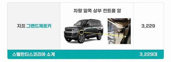 지프 그랜드체로키 3229대는 차량 앞쪽 상부 컨트롤 암 고정 볼트 조립 불량으로 4월 8일(월)부터 시정조치에 들어간다. 컨트롤 암은 자동차 본체와 바퀴를 연결하는 장치를 뜻한다. 이 부품의 조립 불량으로 주행 중 앞바퀴가 차체에서 분리되어 사고가 발생할 수 있다.