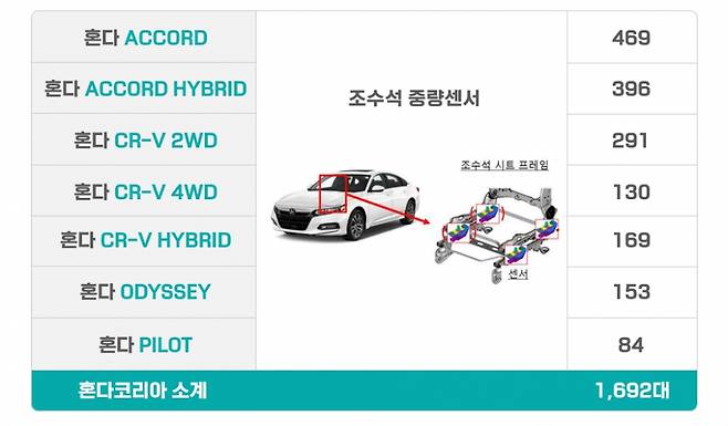 혼다 어코드 등 7개 차종 1692대는 조수석 중량센서 회로기판의 제조 불량으로 4월 5일(금)부터 시정조치에 들어간다. 조수석 중량센서 회로기판의 제조 불량으로 에어백 미전개 조건에서 에어백이 전개되어 탑승자에게 상해를 입힐 가능성이 나왔기 때문이다.