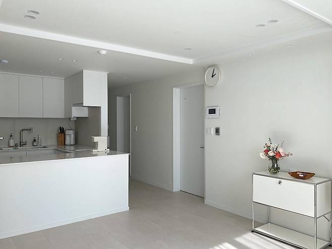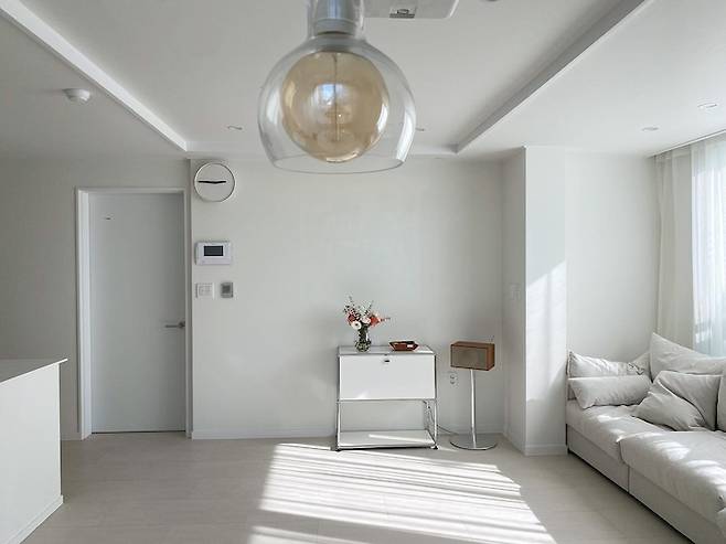 애매한 컬러를 모두 지우고 올 화이트 거실이 탄생했어요! 인테리어를 하면서 몇 가지 지옥에 빠졌는데 그 중 첫 번째 화이트 지옥이에요. (자매품: 타일 지옥, 조명 지옥)