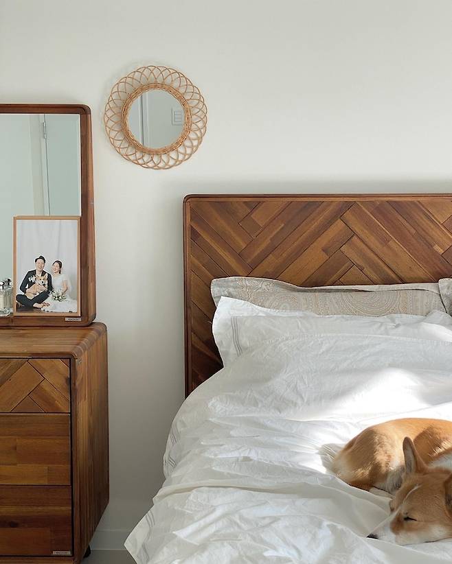 여기는 저희 부부의 아늑한 공간, 안방이에요! 첫 신혼집은 우드 앤 화이트에 꽂혀서 가구들이 죄다 우드우드 했었어요! 안방은 신혼 때 인테리어와 그~대로라고 보시면 돼요!