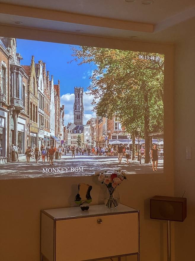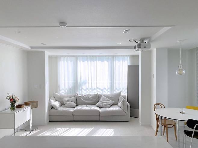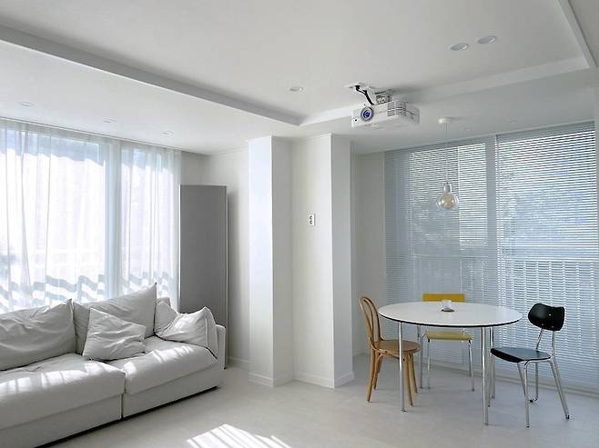 햇살 애개하우스에서 볼 수 없는 한 가지! TV예요! TV보다는 책을 좋아하는 남편 덕(?)에 신혼 때부터 TV 대신 빔 프로젝트를 봤어요! 예전 집에서는 소파 옆에 선반을 두고 그 위에 빔을 놓고 쓰다 보니 여러모로 불편했어요! 이번에는 천장에 전원 선 매립, HDMI 선을 매립해서 깔끔하고 편리하게 빔을 이용 중이에요!