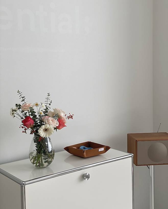 셋탑 박스랑 공유기, HDMI 선 등은 USM Haller에 쏘옥 넣었어요! 모듈 가구 특성 상 뒤판을 아예 없이 쓸 수 있어서 벽에 따로 매립 공간을 못했는데도 깔끔하게 처리했어요! 물론 USM 자체로도 너무 예뻐서 만족이구요🤍