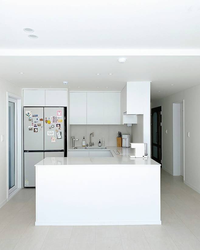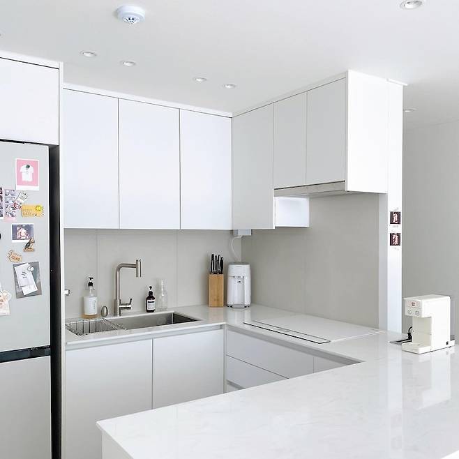 완성된 주방공간! 인덕션을 옆으로 돌리고 그 자리에 비스포크 키친 핏 코타 화이트 냉장고를 넣었어요! 신혼 가전을 산지 다 얼마 되지 않아 냉장고는 당연히 기존 냉장고를 가져오려 했으나 이 주방에는 키친핏 말고는 답이 없어서 예상치 못한 냉장고 구매 비용까지 추가+ 그래도 주방에 어울리게 딱 예쁘죠?!