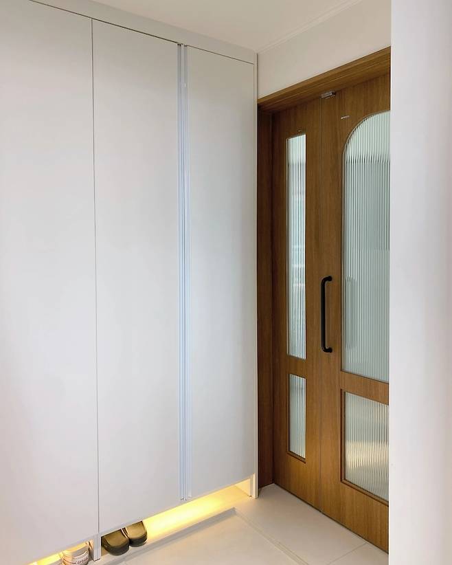 온통 화이트 집이지만 현관은 우드우드로 포인트를 주었어요! 개방감을 위해 유리 중문이나 3연동을 많이 추천해주시는데 아이가 걸으면서 잡기 시작하면 유리는 많이 불안할 것 같았어요! 우드톤으로 집 전체적인 무게감을 잡아주고 아치형 모루유리가 포인트로 마음에 쏙 드는 현관이 완성되었어요!