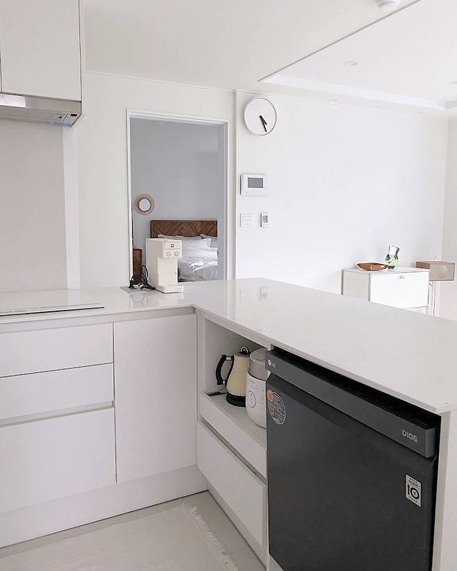 아일랜드 아래쪽으로는 식세기와 밥솥, 전기 포트가 들어가 있어요~ 식세기가 블랙 컬러인데, 거실에서는 감쪽같이 안보여서 더 만족하는 주방 구조예요^^
