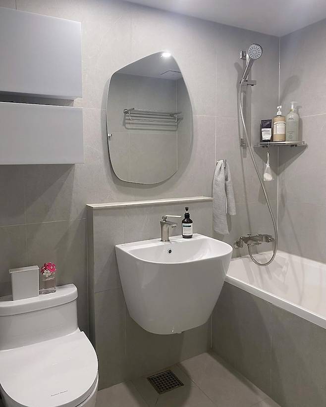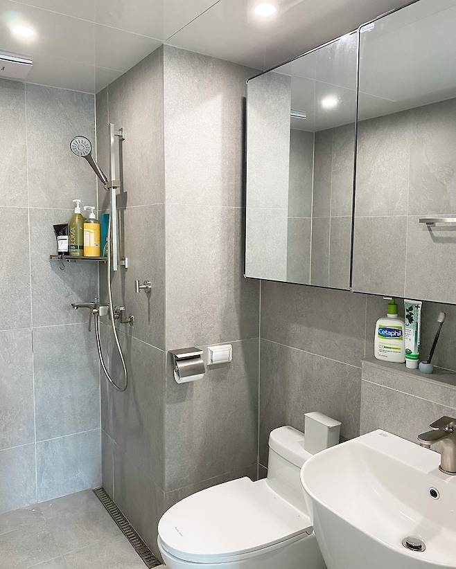 안방 욕실은 공용 욕실과는 비슷하지만 더 어두운 타일로 골랐어요! 공용 욕실 수납장이 예쁘지만 수납이 많이 되지는 않아서 안방 욕실에 큰 거울장을 달았어요~ 도기는 안방도 아메스로! 안방은 플랫 스퀘어로 할까 고민했었는데, 사용감도 편하고 라운드가 더 안정적인 느낌이라 저희 집 분위기에 더 잘 맞는 것 같아요.