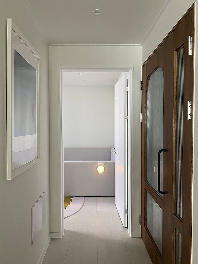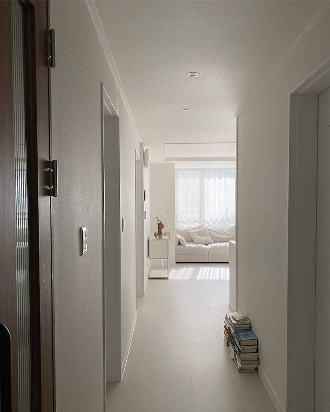 중문을 지나 왼쪽 복도 쪽으로 보이는 거실이에요~ 햇살 가득한 거실☀️로 향하는 이 복도 느낌을 좋아해요. 아직 시스템 선반 시공을 못해서 책들을 복도 바닥에 오브제처럼 두었어요~