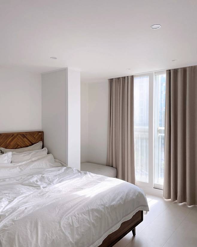 안방은 온전한 휴식 공간으로 디테일을 최소화하고 침구에만 힘을 줬어요!! 쉐르단 제품인데 톡톡한 재질로 호텔 침구 같은 느낌이에요. 화장대는 침대와 세트 제품으로 통일감을 주었구요!!