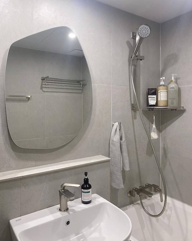 그리고 샤워기 옆에 옷걸이는 꼭 추천이예요~ 샤워볼이나 샤워타월 걸어 놓기 딱이예요! 크지 않은 공간이라 샤워부스는 과감히 제거했어요~ 물이 많이 튀지 않을까 주변에서 걱정했는데, 물은 생각보다 많이 안 튀고 오히려 아기 목욕 시킬 때 개방감이 있어서 더 편하게 사용 중이에요! 좁은 공간은 역시 개방감이 최고!!