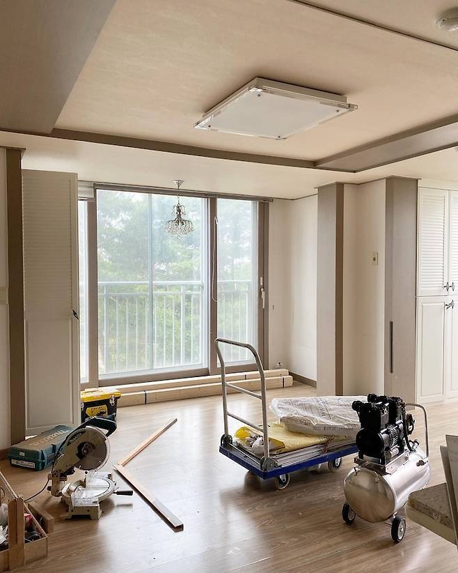 공사 전 거실 모습이에요! 구축 답게 내력벽이 가득하고 애매한 우드 몰딩의 집이었어요~ 평수가 크지도 않고 구조 자체가 답답한 면이 있어서 최대한 넓어 보이게 화이트 톤으로 그리고 수납이 많으면 짐도 어쩔 수 없이 많아지더라고요. 미니멀 라이프를 위해 붙박이장도 다 철거하는 방향으로 공사를 했어요!