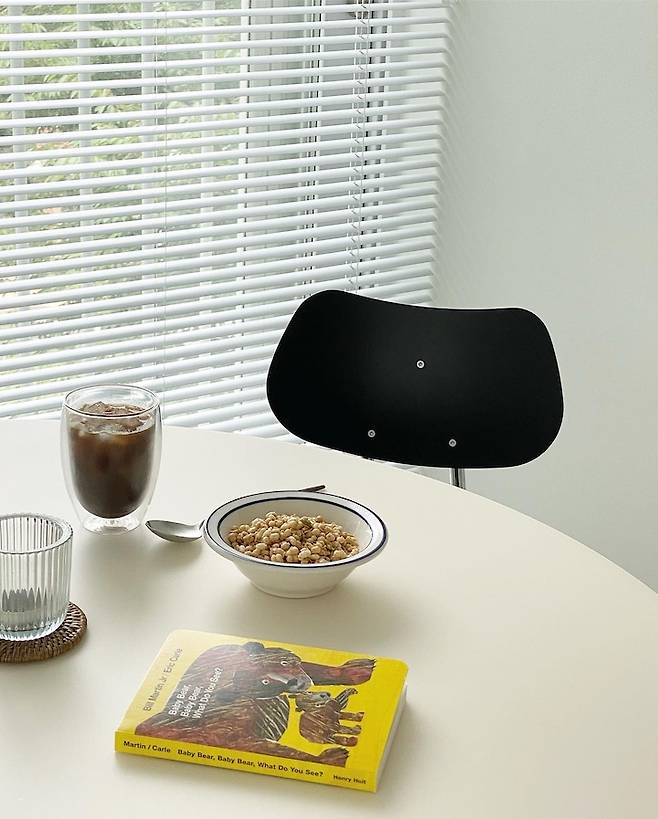 다이닝 공간은 하얀 원형 테이블과 블라인드, 그리고 컬러 의자로 포인트를 주고 있어요! 비아인키노 원형 테이블은 어떤 음식이나 디저트를 올려도 예쁜 감성이 나와서 너무 만족! L&C Stendal 아르노 체어는 블랙이 진짜 예쁜 거 같아요. 등받이도 컴백 체어보다 편해요. 물론 컴백 체어도 너무 예쁘지만^^ 홈 카페에 진심인 제 인스타에서 가장 많이 보이는 포토존이에요!