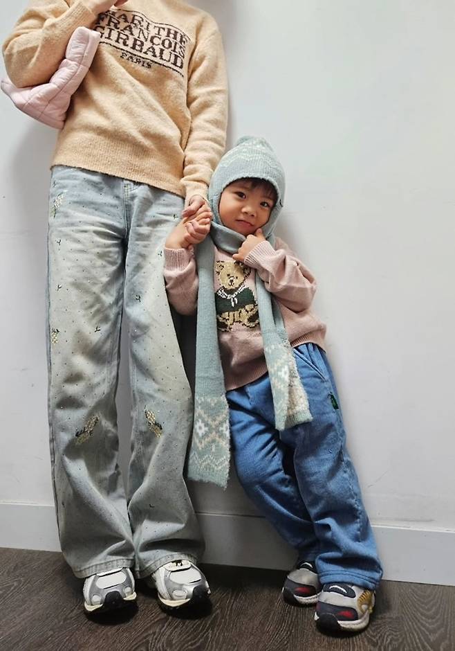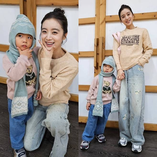 또 아들 시우는 곰돌이 프린트의 연핑크 니트 스웨터에 데님 팬츠를 입고 머플러 니트 비니를 쓴 귀여운 모습으로 엄마 우혜림과 함께 시밀러 모자 커플룩을 완성했다.