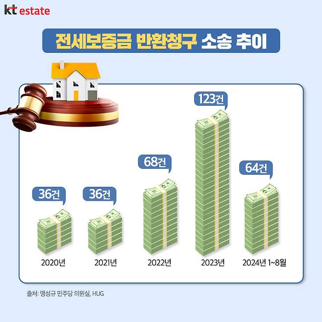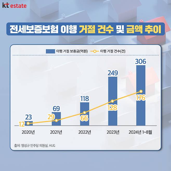 지난해 국회 국토교통위원장 맹성규 더불어민주당 의원이 주택도시보증공사(HUG)에서 제출받은 자료에 따르면, 전세보증금반환 이행 거절 건수는 2020년 12건부터 2021년 29건, 2022년 66건, 2023년 128건으로 급증했습니다. 지급 거절된 금액 규모도 2020년 23억원에서 2023년 249억원으로 매년 크게 늘고 있습니다.