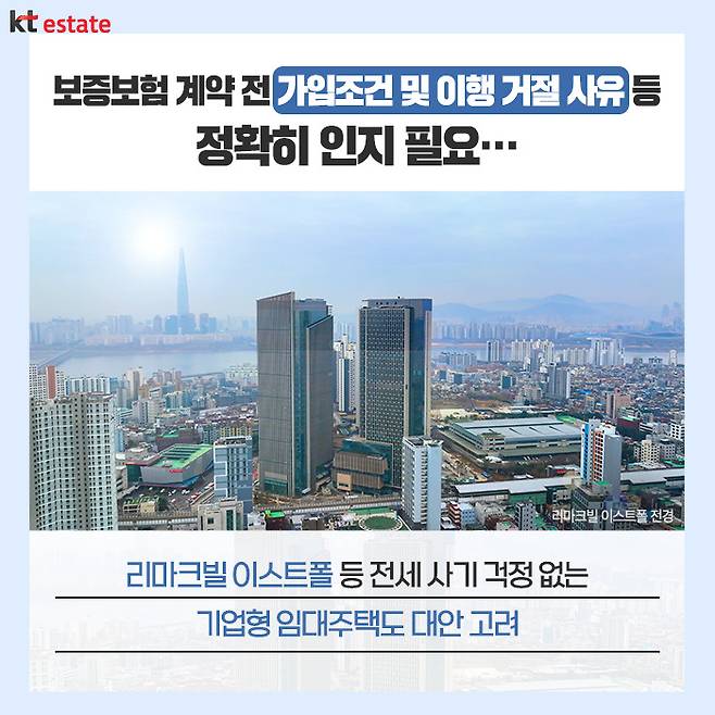 일례로 대기업이 관리하는 ‘기업형 임대주택’의 경우, 자본력이 높고 재무 구조가 안정적이어서 전세 사기나 전세금 미반환 등의 우려가 없어 세입자로부터 선호되고 있습니다. 대표적으로 4월 중 입주 개시 예정인 KT에스테이트의 ‘리마크빌 이스트폴’은 보증금 안심 반환은 물론, 연말정산 시 월세 소득공제로 세금 혜택까지 받을 수 있다는 장점이 있습니다.