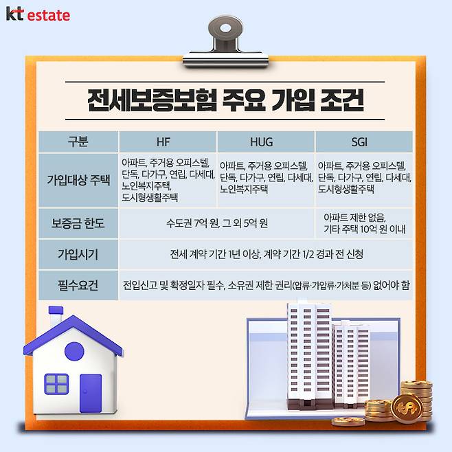 전세보증보험에 가입하기 위해서는 다양한 전세보증보험 가입 조건을 충족해야 합니다. 보증보험은 HUG를 비롯해 한국주택금융공사(HF), 서울보증보험(SGI) 등에서 가입할 수 있으며, 기관별로 가입 조건에 약간의 차이가 있습니다.