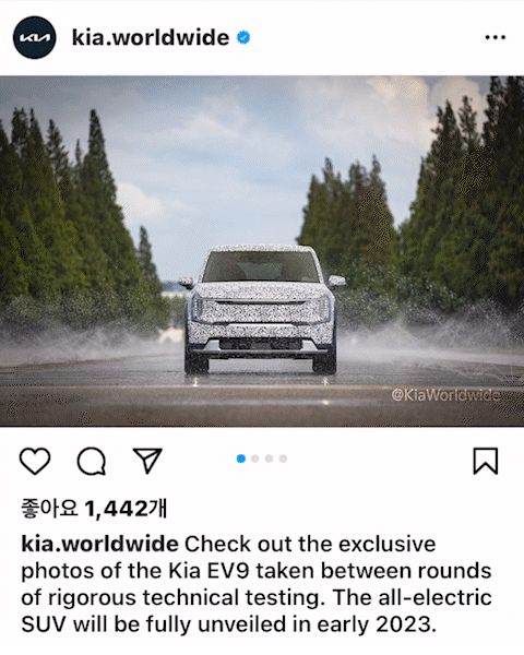 [스파이샷 갤러리] 기아는 EV6이후 자사 전기차 라인업을 장식할, 전동화 SUV모델 EV9의 테스트카를 자사 소셜미디어(Instagram @kia.worldwide) 채널을 통해 공개했다. 일반적으로 테스트카는 세계 자동차 팬들을 통해 스파이샷으로 포착되곤 하지만, 기아에서 테스트 중인 미출시 모델을 직접 공개한 것은 이례적이다. EV9은 기아 전동화 라인업의 플래그쉽 모델로 2023년 글로벌 데뷔를 앞두고 있다.