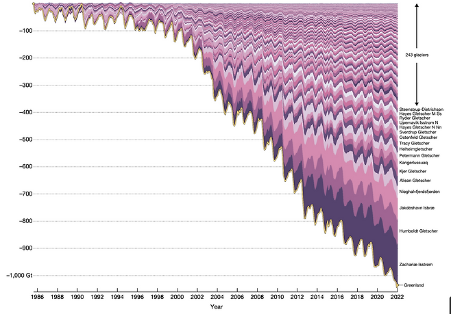 - 지난 28년 동안 그린란드의 빙하 5조 톤 가운데 1조 톤이 사라졌다. 네이처에 발표된 논문이다.