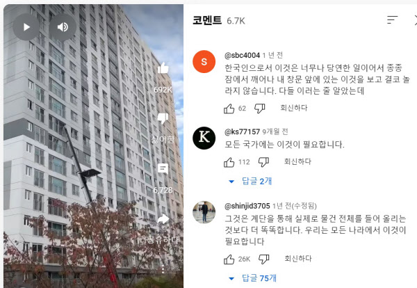 우리나라에선 이삿날마다 꽤 흔히 볼 수 있는 광경이지만, 댓글 창을 보면 외국인들이 “신기하다, 모든 국가에 사다리차를 도입해야 한다”, “엘리베이터로 이사하는 것보다 훨씬 쉬워 보인다”는 등 폭발적인 반응을 보이고 있는 점이 눈에 띈다.
