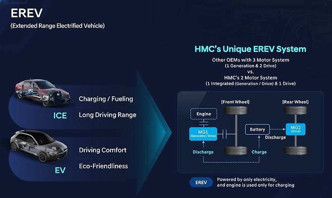 EREV는 순수 전기차와 같이 모터로 차량을 구동하는 동시에 내장된 소형 가솔린 엔진을 통해 배터리를 충전하는 방식으로, 일상적인 도심 주행에서는 전기차로서의 효율을 누리고, 장거리 주행 시에는 연료 기반 주행으로 전환할 수 있어 주행거리 불안감을 해소할 수 있는 차세대 친환경차다.