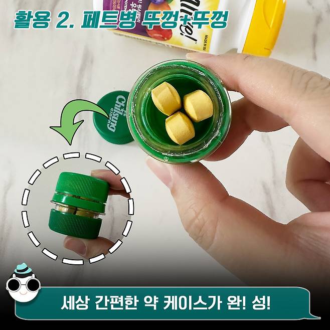 이런 페트병 뚜껑에 평소 챙겨먹는 영양제 같은 걸 넣어두고 또 다른 페트병 뚜껑으로 닫아주면? 세상 간편한 약 케이스가 탄생~