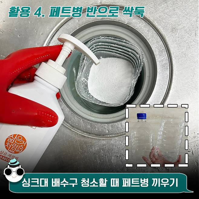 이번에는 페트병을 반으로 싹둑 잘라보세요! 그 뒤 윗부분을 싱크대 배수구에 쏙 넣어봅니다. 이렇게 되면 배수구 구멍을 막게 되는데요.